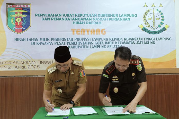 BANDARLAMPUNG,LGNews.com – Gubernur Lampung Rahmat Mirzani Djausal menyerahkan Surat Naskah Perjanjian Hibah Daerah (NPHD) berupa lahan di Kawasan Pusat Pemerintahan Kota Baru, Kecamatan Jati Agung, Kabupaten Lampung Selatan kepada Kepala Kejaksaan Tinggi Lampung, Dr. Kuntadi, S.H., M.H, di Ruang Vicon Kejaksaan Tinggi Provinsi Lampung, Senin (21/04/2025).
