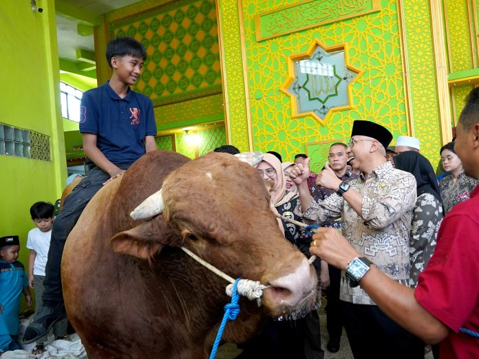 BANDARLAMPUNG,LGNews.com — Gubernur Lampung, Rahmat Mirzani Djausal, menyerahkan secara simbolis seekor sapi kurban bantuan kemasyarakatan dari Presiden Republik Indonesia kepada pengurus Masjid Jami Nurussa’adah, Kelurahan Panjang Utara, Kota Bandar Lampung, Kamis (5/6/2025).