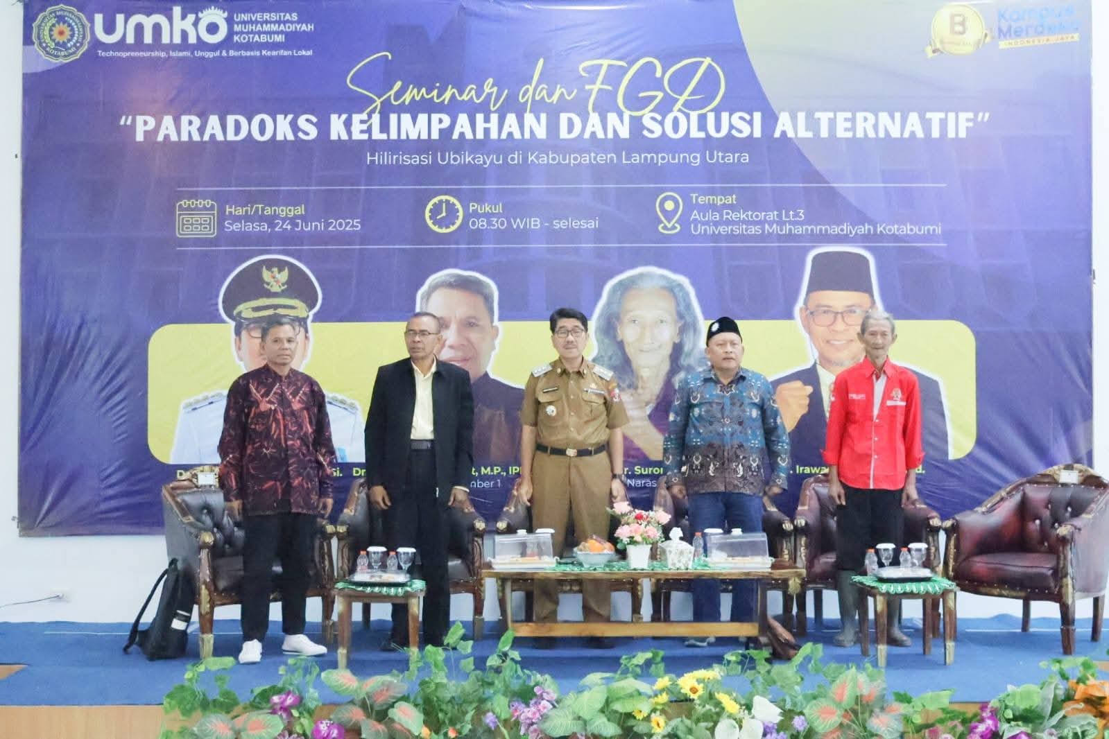 Bupati Lampung Utara, Dr. Ir. Hamartoni Ahadis, M.Si., menghadiri dan membuka Seminar serta Forum Group Discussion (FGD) bertema “Paradoks Kelimpahan dan Solusi Alternatif” yang digelar di Universitas Muhammadiyah (UM) Kotabumi. Acara ini mengangkat isu strategis tentang hilirisasi ubi kayu, sebagai komoditas unggulan yang berlimpah di Kabupaten Lampung Utara.