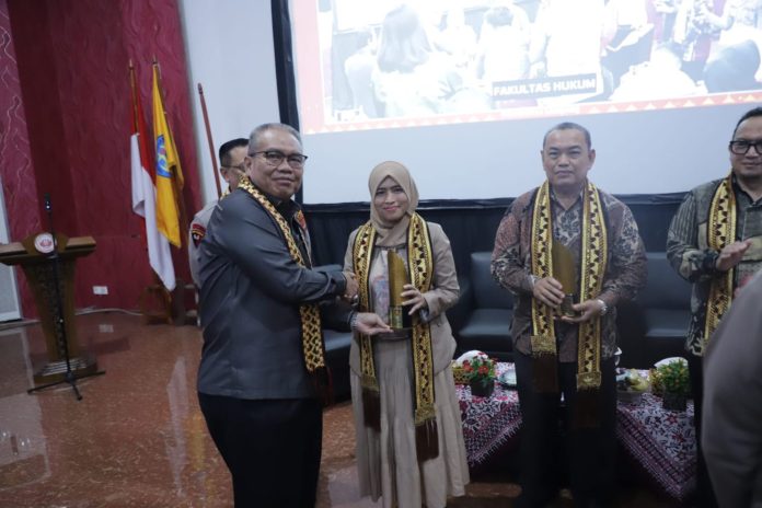 Turut hadir mewakili Rektor Unila, Wakil Rektor Bidang Keuangan dan Umum, Dr. Habibullah Jimad, S.E., M.Si., Hakim Tinggi Provinsi Lampung, Dekan FH Unila, para Guru Besar dan Dosen FH Unila.