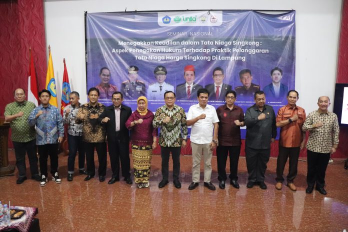 Hal tersebut ditegaskan oleh Gubernur Lampung yang diwakili oleh Asisten II Bidang Perekonomian dan Pembangunan Provinsi Lampung, Mulyadi Irsan saat menjadi narasumber dalam Seminar Nasional yang mengusung tema ‘Menegakkan keadilan dalam tata niaga singkong: Aspek Penegakan Hukum terhadap praktik pelanggaran tata niaga harga singkong di Lampung’ bertempat di Auditorium Prof. Abdul Kadir Muhammad Fakultas Hukum (FH) Unila, Sabtu (26/07/2025).