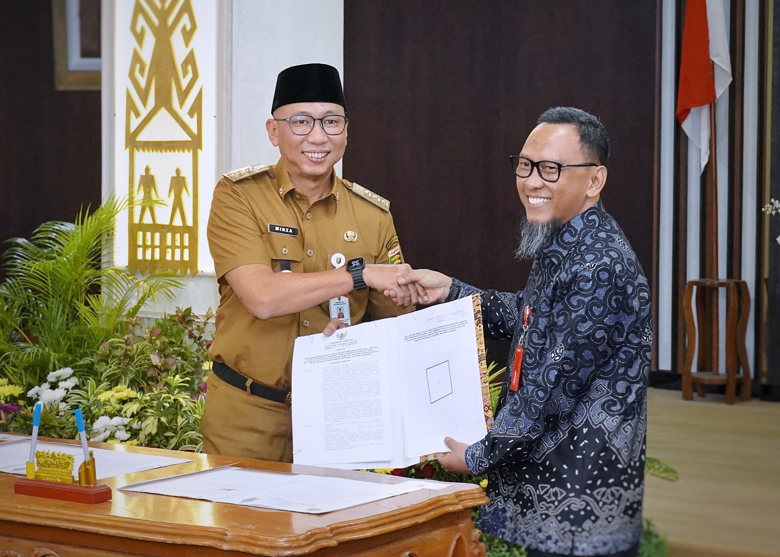 Bandar Lampung,LGNews.com — Gubernur Lampung, Rahmat Mirzani Djausal bersama Kepala Kantor Wilayah Badan Pertanahan Nasional (BPN) Provinsi Lampung, Hasan Basri Natamenggala menandatangani Naskah Perjanjian Hibah Daerah (NPHD), disaksikan langsung oleh Menteri Agraria dan Tata Ruang/Kepala BPN RI, Nusron Wahid. Penandatanganan berlangsung di Ruang Abung, Balai Keratun, Selasa (29/7/2025).