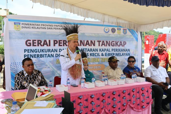 Kepulauan Yapen,LGNews.com — Penjabat (Pj) Gubernur Papua Agus Fatoni meninjau langsung Gerai Perikanan Tangkap yang diselenggarakan di Pulau Cina Kecil, Serui Jaya, Kabupaten Kepulauan Yapen, Papua, Kamis (31/07/2025). Di gerai ini disediakan pengukuran dan pendaftaran kapal perikanan penerbitan dokumen e-Pas kecil dan E-BKP secara gratis bagi para nelayan.