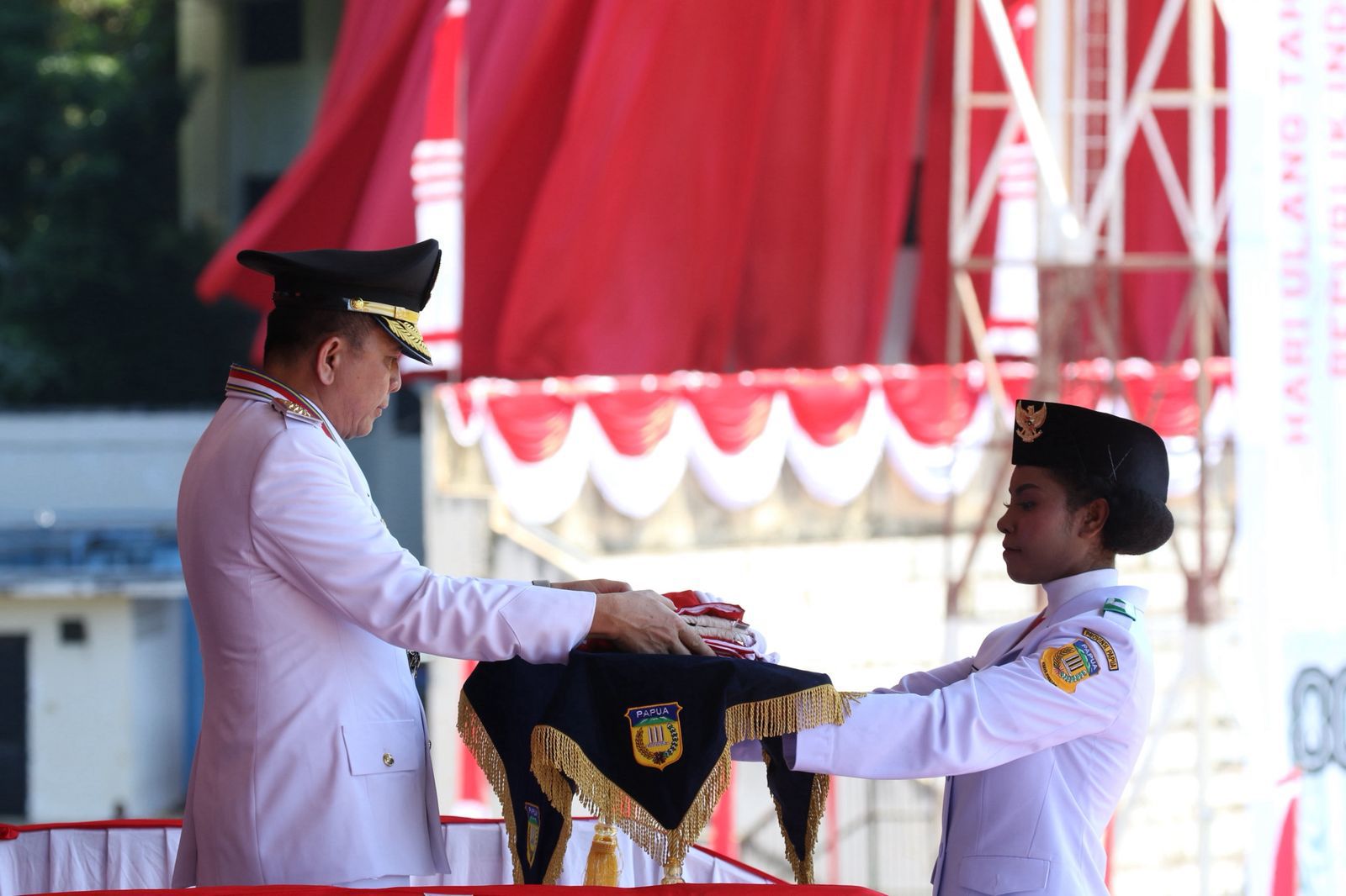 Pelaksanaan pengibaran sang Merah Putih dilakukan oleh putra/putri terbaik Papua yang tergabung dalam Paskibraka. Mereka dikukuhkan langsung oleh Pj. Gubernur Papua Agus Fatoni pada Sabtu (16/8) kemarin.