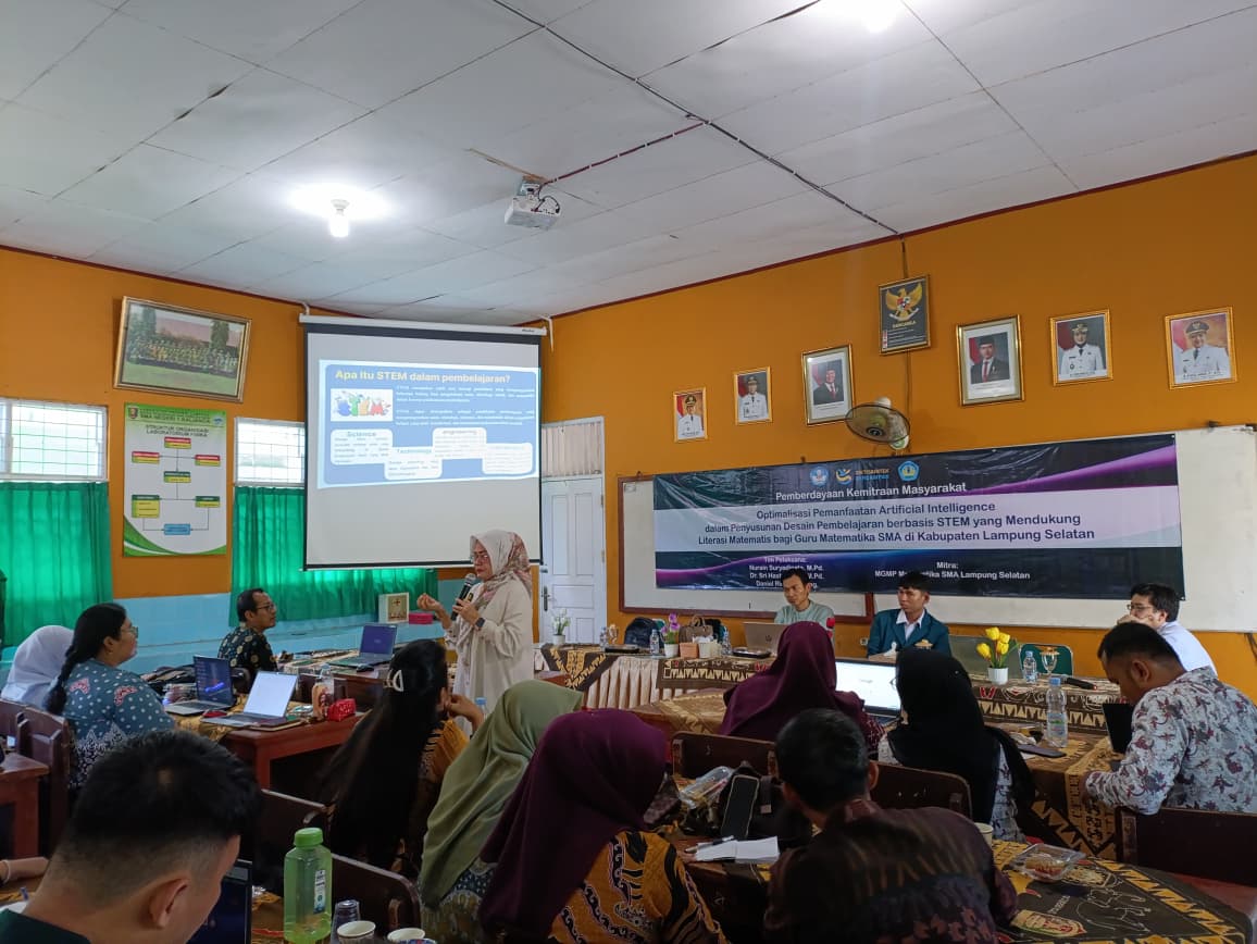Pelatihan yang berlangsung di SMA Negeri 1 Kalianda, Sabtu pagi, 1 November 2025, bertujuan meningkatkan kompetensi guru matematika dalam mengintegrasikan pendekatan STEM (Science, Technology, Engineering, Mathematics) dengan teknologi kecerdasan buatan (AI) guna mendukung penguatan literasi matematis di sekolah.