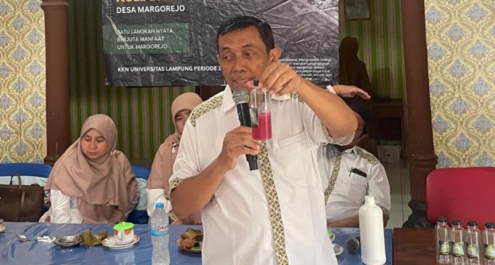Sosialisasi menghadirkan pemateri dari Fakultas Matematika dan Ilmu Pengetahuan Alam (FMIPA) Jurusan Kimia Unila, yaitu Dr. Syaiful Bahri, S.Si., M.Si., Dr. Yuli Ambarwati, S.Si., M.Si., Dr. Sonny Widiarto, S.Si., M.Sc., Hapin Afriyani, S.Si., M.Si., dan Devi Nur Anisa, S.Pd., M.Sc. Kegiatan ini turut melibatkan perangkat desa, kelompok tani, serta mahasiswa KKN Desa Margorejo.