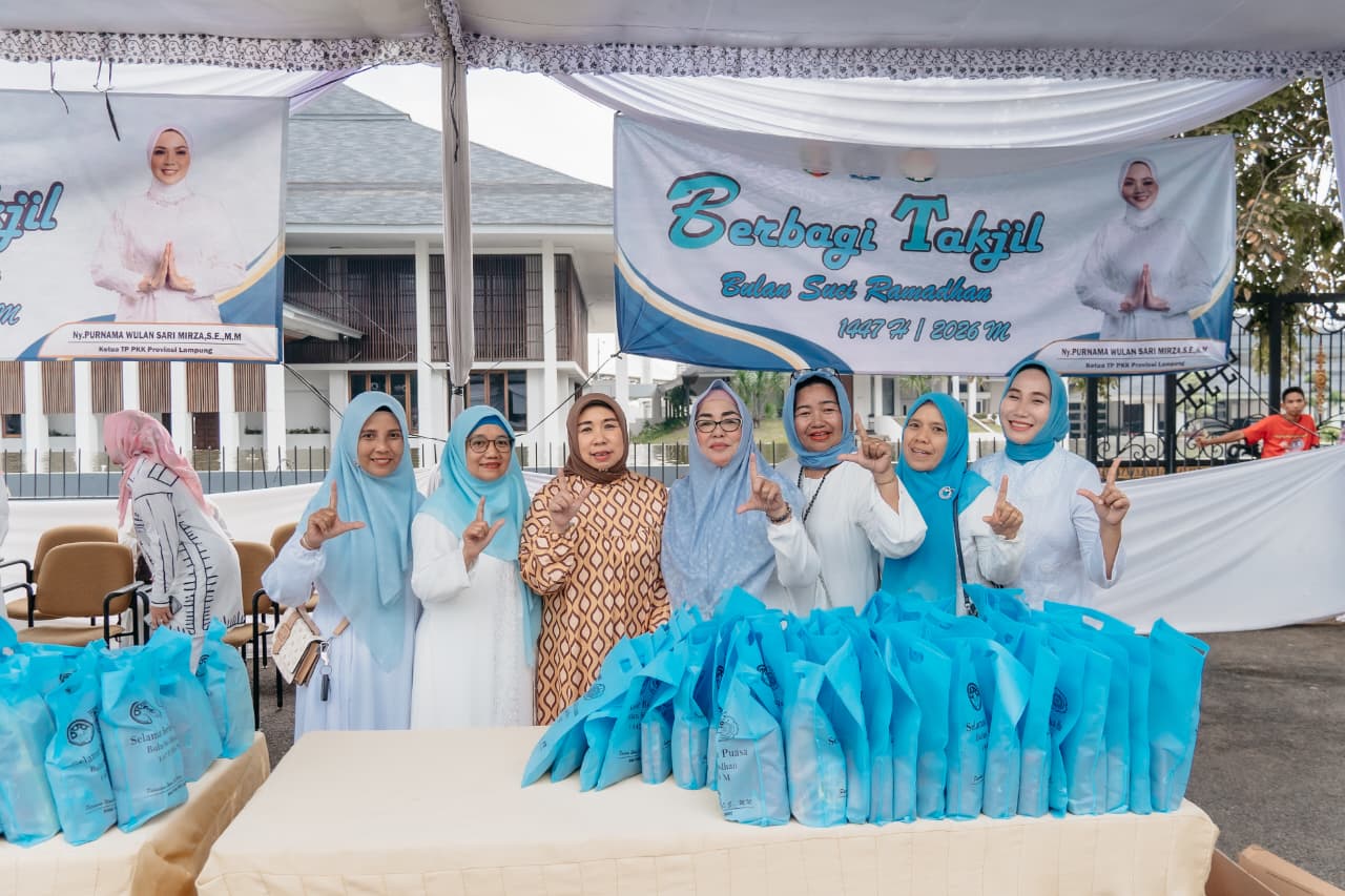 Bandar Lampung, LGNews.com — Memasuki hari keenam pelaksanaan kegiatan berbagi takjil Ramadan 1447 Hijriah, Tim Penggerak PKK Provinsi Lampung bersama Dharma Wanita Persatuan (DWP) Provinsi Lampung kembali membagikan paket berbuka puasa kepada masyarakat di depan Mahan Agung, Minggu (01/03/2026).