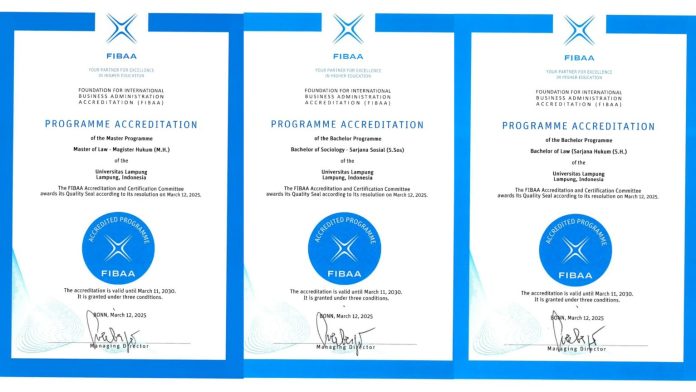 (Unila) LGNews.com : Universitas Lampung (Unila) sukses mencatatkan pencapaian signifikan dalam peta pendidikan internasional dengan raihan akreditasi dari Foundation for International Business Administration Accreditation (FIBAA).